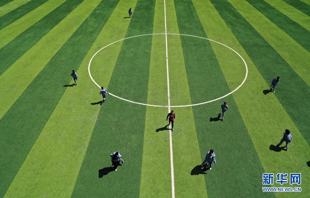 寧夏吳忠市同心縣豫海初級(jí)中學(xué)學(xué)生在上體育課(2020年9月18日攝,無(wú)人機(jī)照片)。新華社記者 王鵬 攝