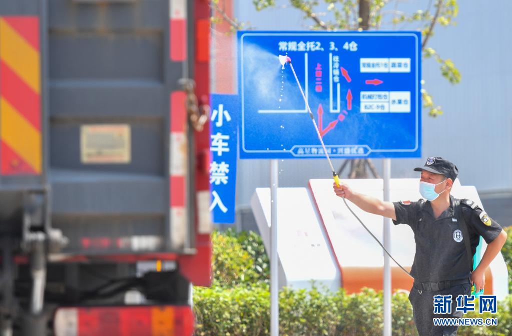 8月1日,在位于長沙市望城區(qū)的湖南高星物流園門口,工作人員對進入園區(qū)的貨車消毒。