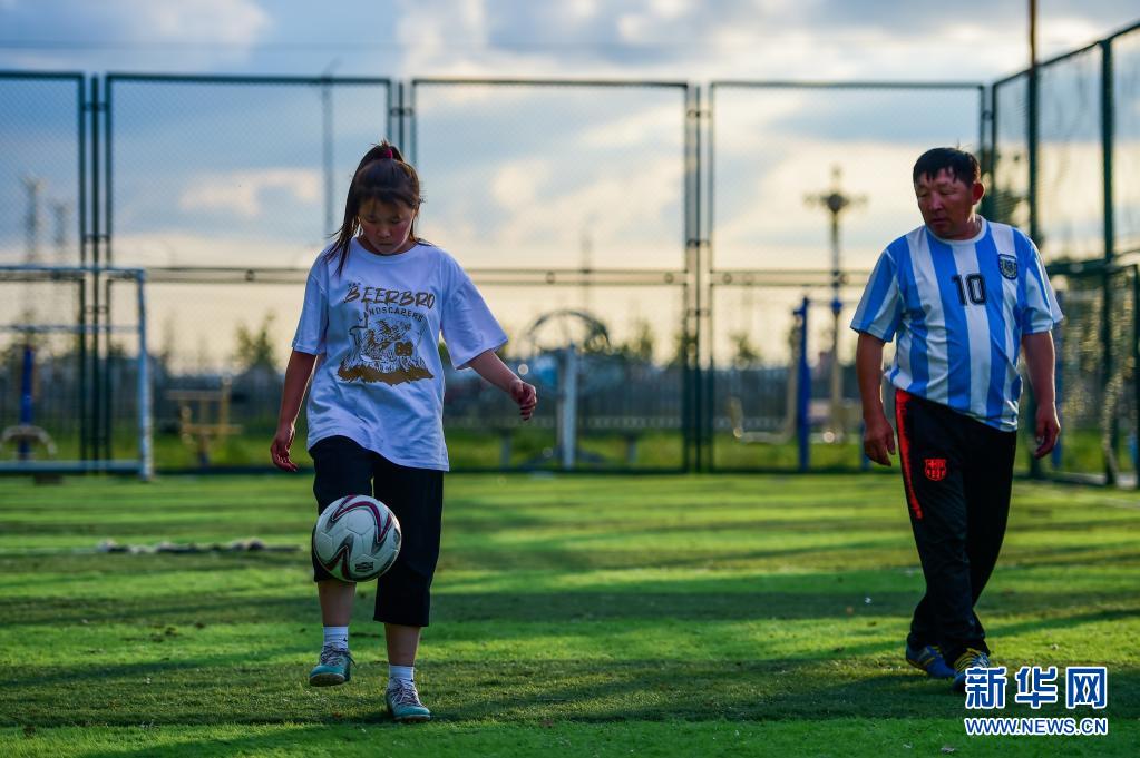 7月26日,吉布斯樂瑪(左)和父親嘎拉巴特爾在錫尼河西蘇木一處足球場(chǎng)踢球。