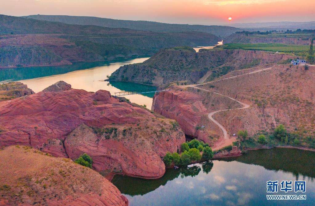 8月6日,朝霞映照下的靖邊縣龍洲鎮(zhèn)波浪谷丹霞景區(qū)(無人機(jī)照片)。