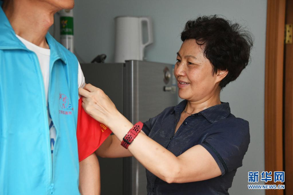 8月14日,在北京市海淀區(qū)薊門里社區(qū),董星梅在家中為準備去社區(qū)出入口值守的丈夫馮向東整理著裝。