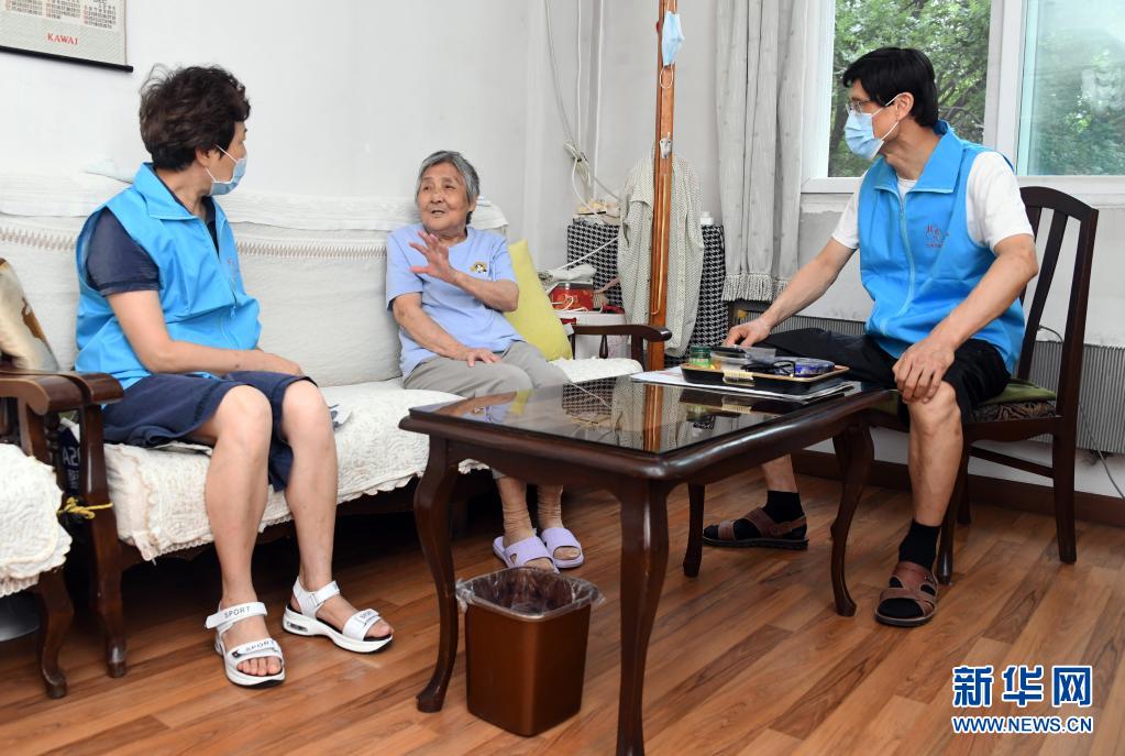 8月14日,在北京市海淀區(qū)薊門里社區(qū),董星梅(左)和丈夫馮向東(右)與他們的志愿服務(wù)對象交談。