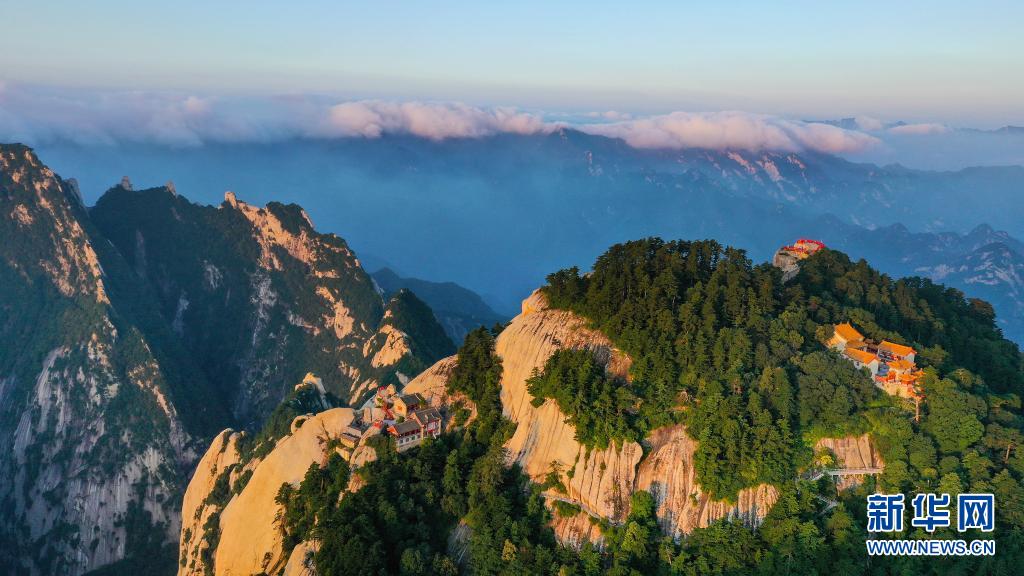 晨曦初露,位于陜西省渭南市的華山景區(qū)沐浴在霞光之中,景色壯美。