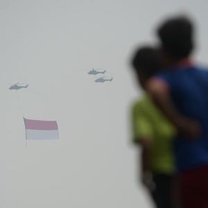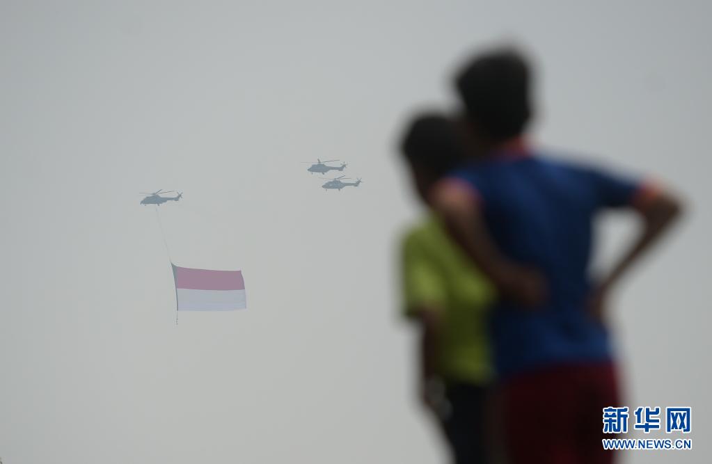 8月17日,人們注視著懸掛印度尼西亞國(guó)旗的直升機(jī)飛過雅加達(dá)上空。8月17日是印度尼西亞獨(dú)立日。新華社發(fā)(祖卡南攝)