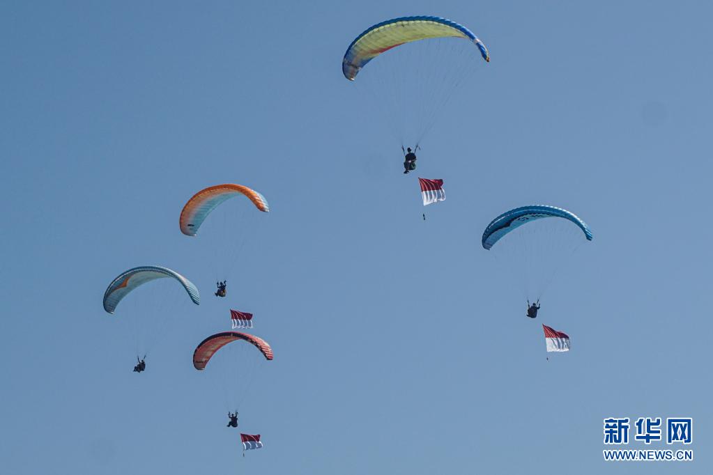 8月17日,懸掛印度尼西亞國(guó)旗的滑翔傘飛過(guò)巴厘島上空。8月17日是印度尼西亞獨(dú)立日。新華社發(fā)(比辛拉西攝)