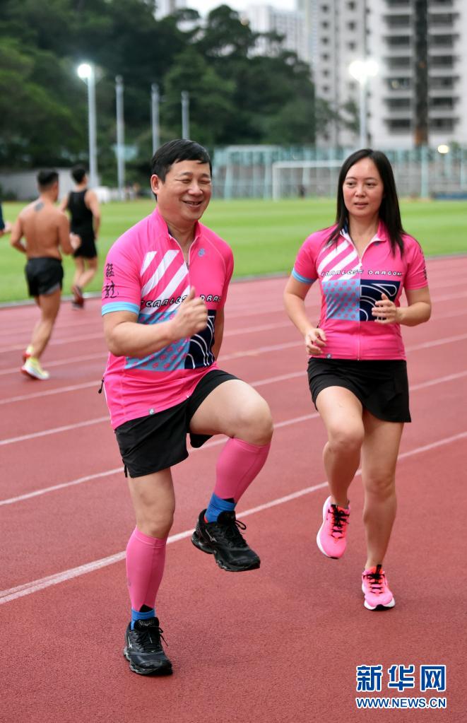猛龍長跑隊(duì)創(chuàng)辦人莫儉榮(左)與領(lǐng)跑員嚴(yán)惠茵訓(xùn)練前進(jìn)行熱身(7月29日攝)。