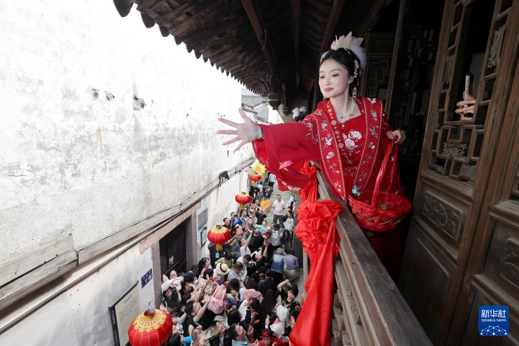 4月4日,在浙江省湖州市德清县新市古镇,“蚕花姑娘”向蚕农撒蚕花。