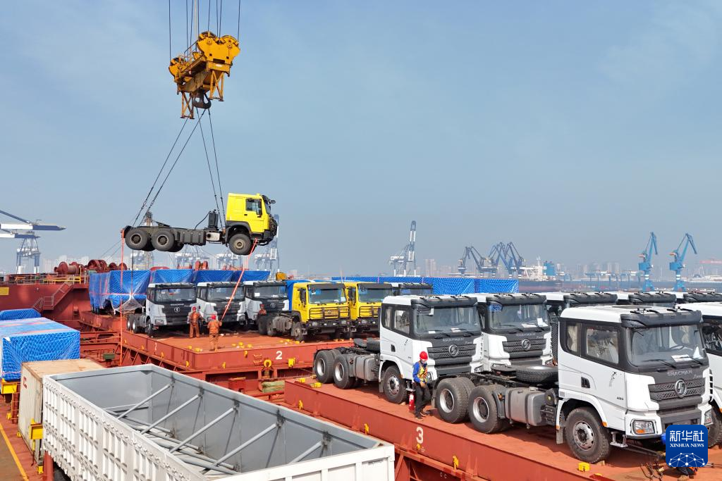 4月14日,出口几内亚的卡车在山东港口烟台港装入中非班轮(无人机照片)。