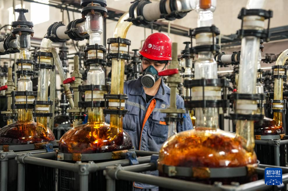4月13日,在金昌神泥科技有限公司萃取车间,工作人员进行稀贵金属萃取作业。