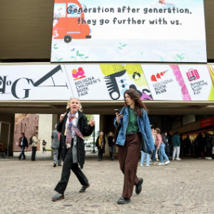 4月13日,在意大利博洛尼亚举行的博洛尼亚国际童书展上,观众从展会主题海报前走过。