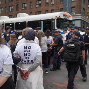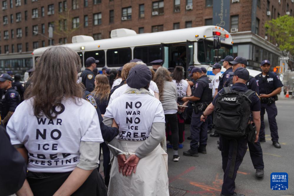 4月13日,民众在美国纽约曼哈顿举行反对战争、声援巴勒斯坦,以及反对美国移民与海关执法局驱逐移民的抗议活动。