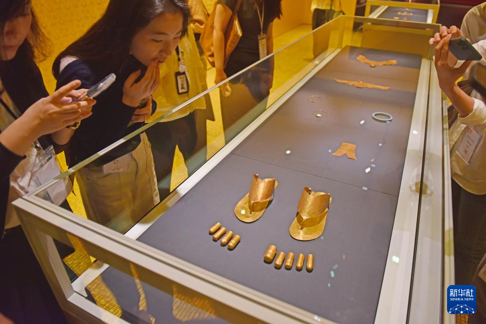 4月14日,媒体记者在参观埃及脚趾套和拖鞋。