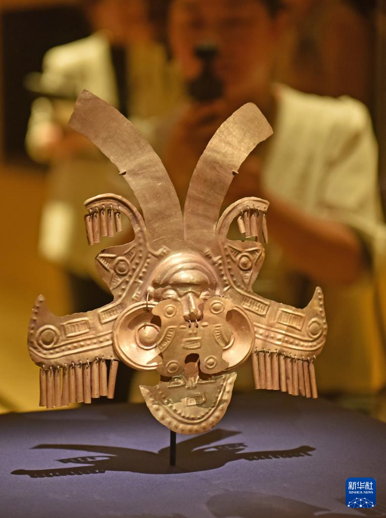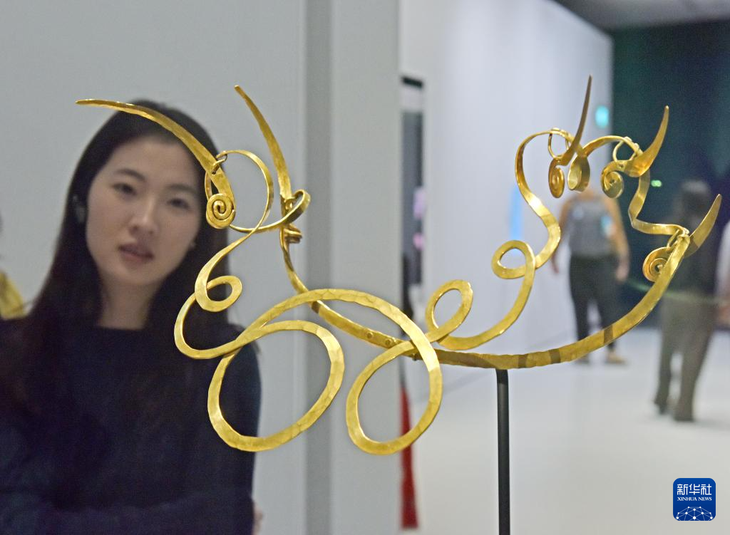 4月14日,媒体记者在拍摄哥伦比亚头饰。