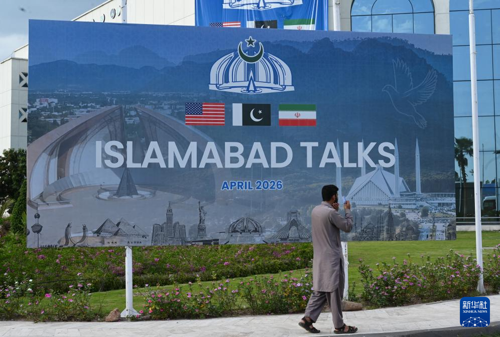 这是4月11日在巴基斯坦首都伊斯兰堡拍摄的美伊谈判相关海报。