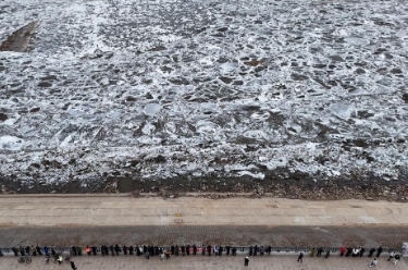 4月12日,人们在观赏松花江干流富锦段流冰景观。