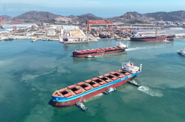4月13日,21万吨绿色燃料船舶驶离中国船舶集团青岛北海造船有限公司码头启程海试。