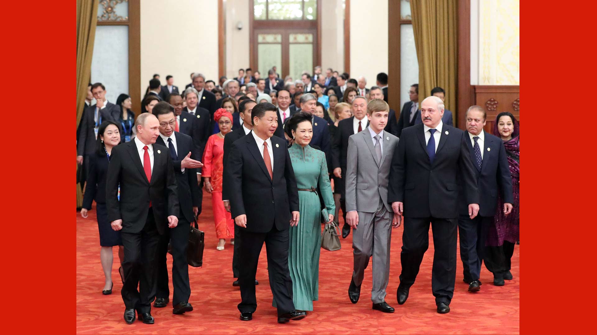5月14日,國(guó)家主席習(xí)近平在北京人民大會(huì)堂舉行宴會(huì),歡迎出席“一帶一路”國(guó)際合作高峰論壇的外方代表團(tuán)團(tuán)長(zhǎng)及嘉賓。這是習(xí)近平和夫人彭麗媛同貴賓們一同步入宴會(huì)廳。新華社記者 劉衛(wèi)兵 攝