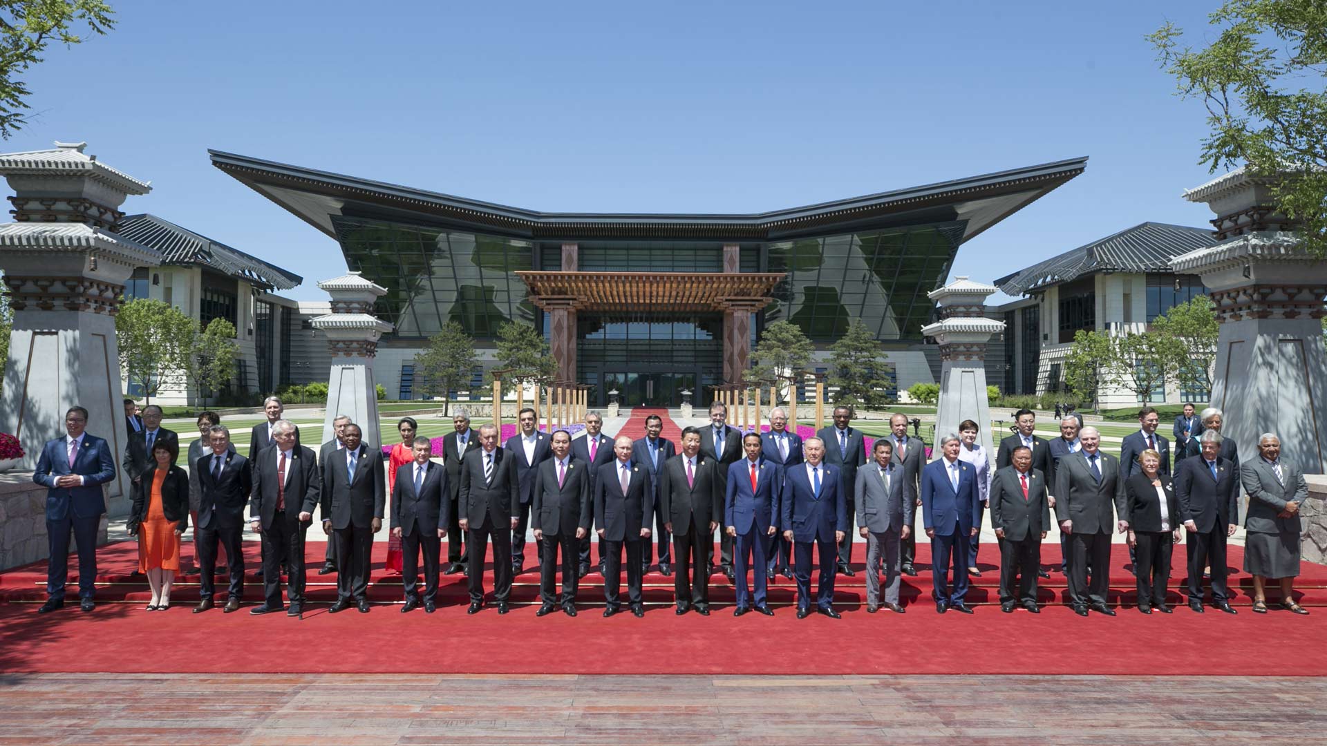 5月15日,“一帶一路”國(guó)際合作高峰論壇圓桌峰會(huì)在北京雁棲湖國(guó)際會(huì)議中心舉行,國(guó)家主席習(xí)近平主持會(huì)議并致開(kāi)幕辭。這是第一階段會(huì)議結(jié)束后,習(xí)近平同外方代表團(tuán)團(tuán)長(zhǎng)及嘉賓在雁棲湖國(guó)際會(huì)議中心前合影。新華社記者 姚大偉 攝