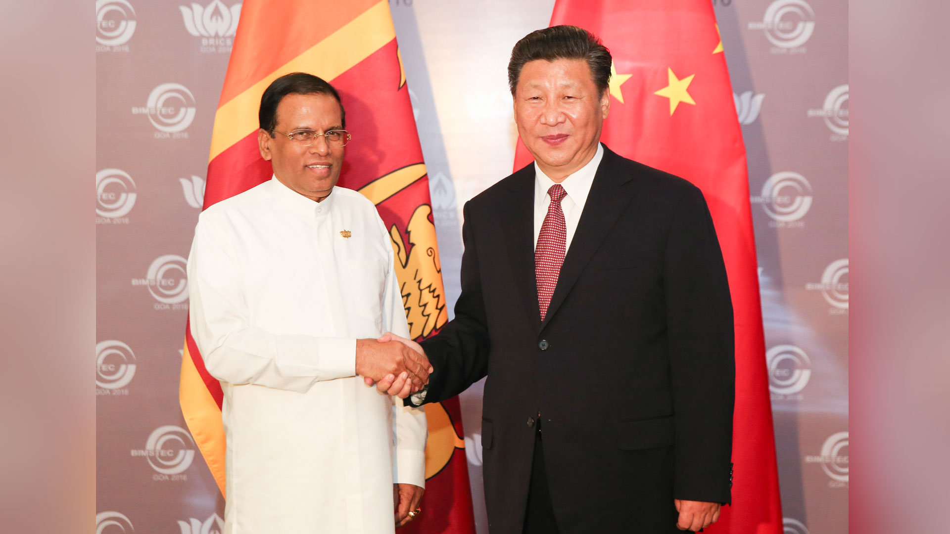10月16日,國家主席習近平在印度果阿會見斯里蘭卡總統西里塞納。 新華社記者 丁林 攝