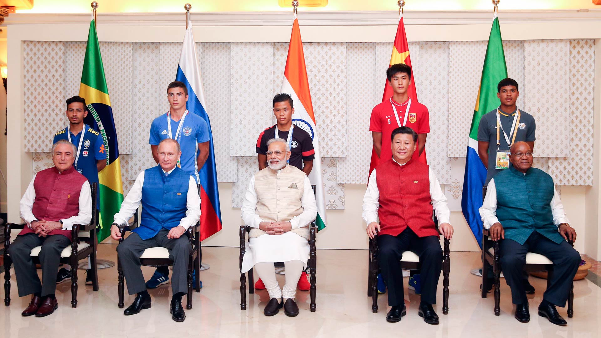10月15日,國家主席習近平與印度總理莫迪、南非總統祖馬、巴西總統特梅爾、俄羅斯總統普京在印度果阿同參加金磚國家17歲以下少年足球賽的各國代表隊隊長合影。新華社記者 姚大偉 攝