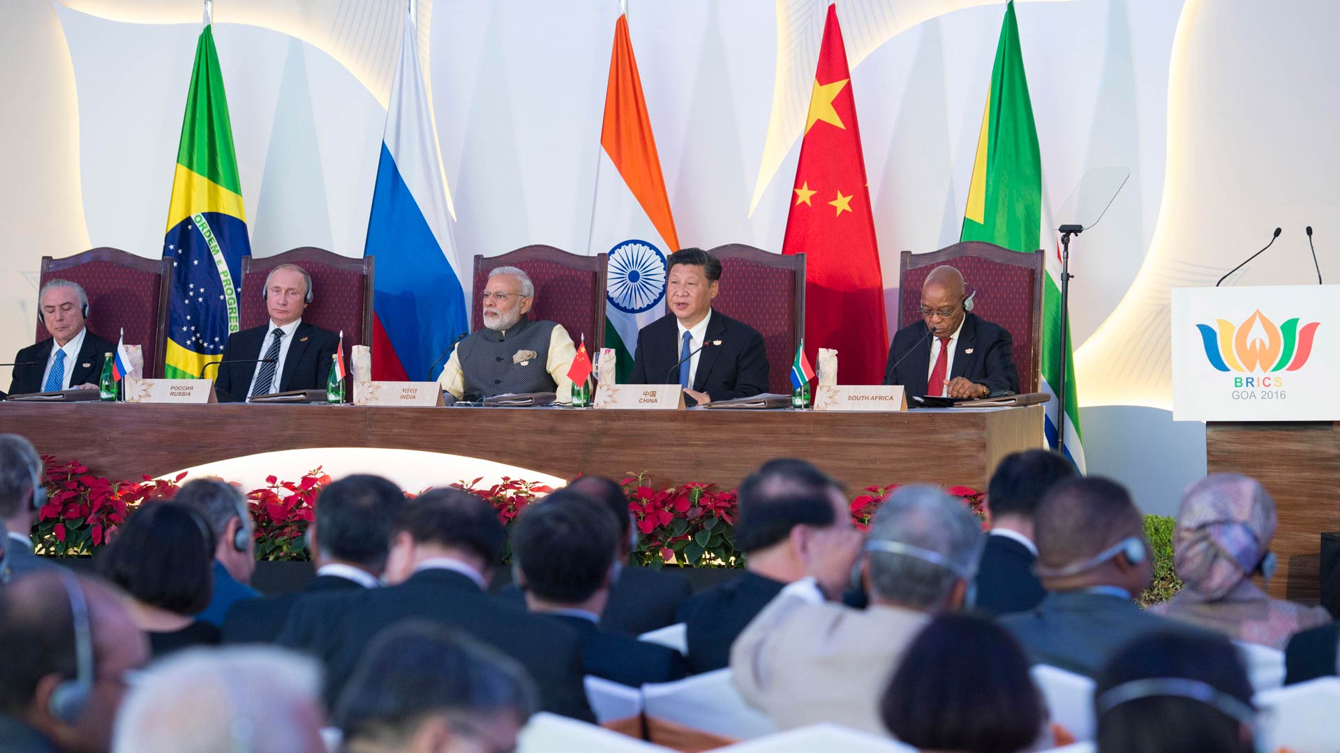 10月16日,金磚國家領導人第八次會晤在印度果阿舉行。中國國家主席習近平、印度總理莫迪、南非總統祖馬、巴西總統特梅爾、俄羅斯總統普京出席。習近平發(fā)表題為《堅定信心 共謀發(fā)展》的重要講話。新華社記者 姚大偉 攝