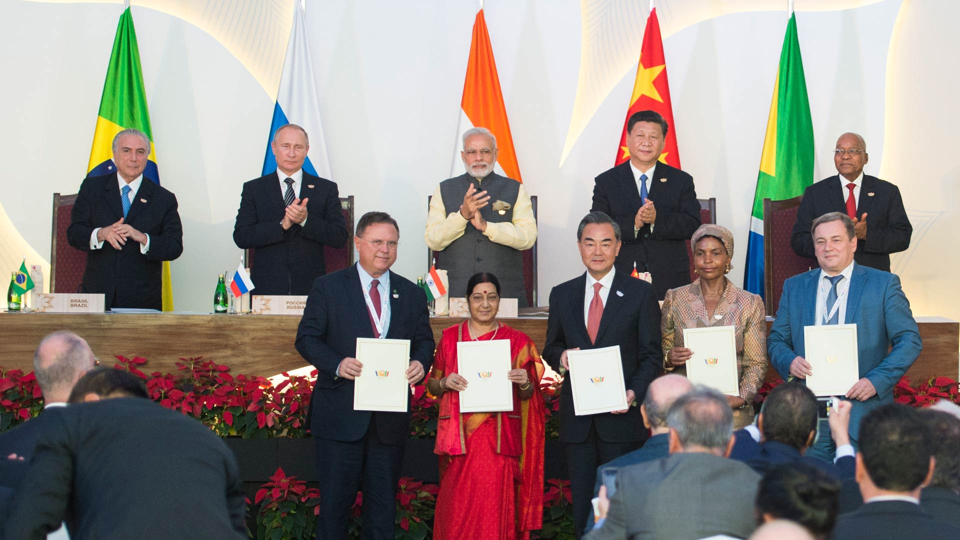 10月16日,金磚國家領導人第八次會晤在印度果阿舉行。中國國家主席習近平、印度總理莫迪、南非總統祖馬、巴西總統特梅爾、俄羅斯總統普京出席。這是會晤結束后,5國領導人共同見證合作文件的簽署,并出席聯合記者會。新華社記者 謝環(huán)馳 攝