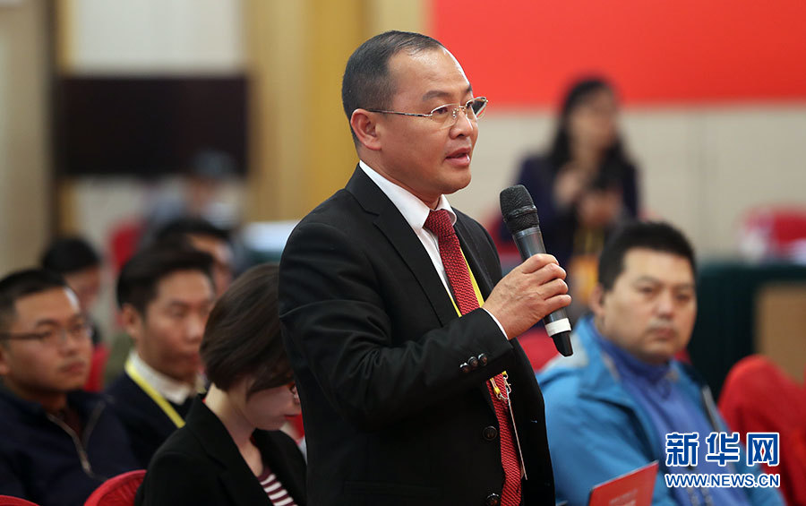 10月22日,十九大新聞中心在梅地亞中心二層新聞發(fā)布廳舉辦集體采訪活動,邀請教育領域代表談“教育綜合改革”。圖為美國全美電視臺記者提問。新華網 郝廣鵬攝