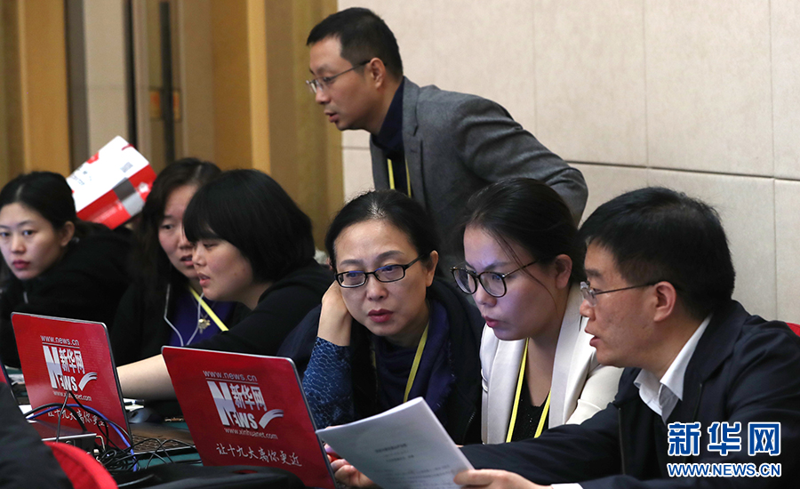 10月26日上午10:00,中國共產(chǎn)黨第十九次全國代表大會(huì)新聞發(fā)言人在梅地亞賓館二層新聞發(fā)布廳召開專題新聞發(fā)布會(huì),請(qǐng)有關(guān)方面負(fù)責(zé)人解讀十九大報(bào)告,并回答記者關(guān)心的問題。圖為新華網(wǎng)在現(xiàn)場直播。新華網(wǎng)?翟子赫 攝