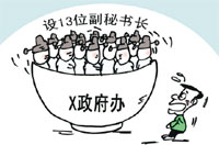 | 類似上述副秘書長、副市長成群的現(xiàn)象,并不是個別的。湖南有個縣有10個副縣長和4個縣長助理。安徽也有一貧困縣設(shè)10個副縣長。不久前,新華網(wǎng)又報道說,廣東清遠(yuǎn)鹽業(yè)公司擬提拔5人為中層干部。這個只有45名職工的公司干部將達(dá)28人,這意味著28位領(lǐng)導(dǎo)僅指揮著17名職工,即領(lǐng)導(dǎo)和被領(lǐng)導(dǎo)的比例約為1.6:1。官多兵少,如此比例,堪稱一絕?!〈罅Ψ锤酶锶吖?,給地方政府“瘦身”,此其時矣!