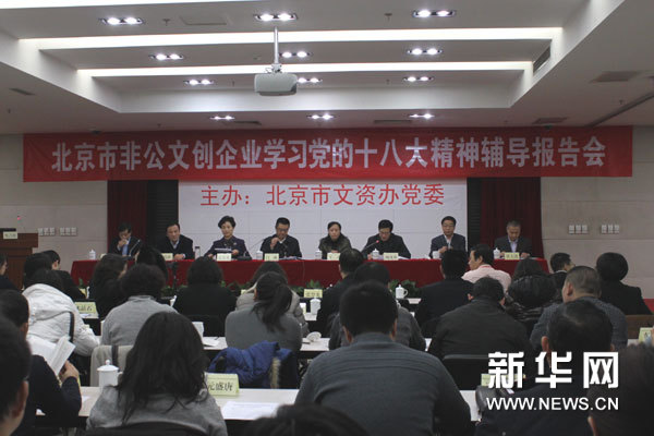 ??? 新華網(wǎng)北京11月28日電 (記者 陳元)27日,北京市國有文化資產(chǎn)監(jiān)督管理辦公室(簡(jiǎn)稱文資辦)召開非公有制文化創(chuàng)意企業(yè)學(xué)習(xí)宣傳黨的十八大精神輔導(dǎo)報(bào)告會(huì)。來自北京市的百余家非公文創(chuàng)企業(yè)代表參加了報(bào)告會(huì)。