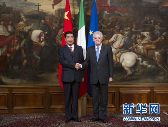 ????當(dāng)?shù)貢r(shí)間11月28日,全國(guó)政協(xié)主席賈慶林在羅馬會(huì)見意大利總理蒙蒂。(來源:新華社記者 李學(xué)仁 攝)