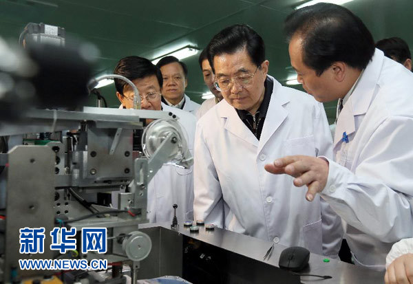 ????12月1日至6日,國(guó)家主席胡錦濤在貴州考察工作。這是胡錦濤在裕能科爾微電子股份有限公司深入了解企業(yè)技術(shù)創(chuàng)新情況。 新華社記者 鞠鵬 攝