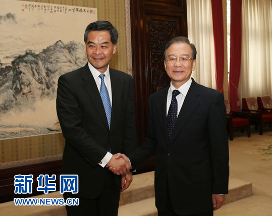 ???? 12月21日,中國國務(wù)院總理溫家寶在北京中南海會見來京述職的香港特別行政區(qū)行政長官梁振英。 新華社記者 劉衛(wèi)兵 攝