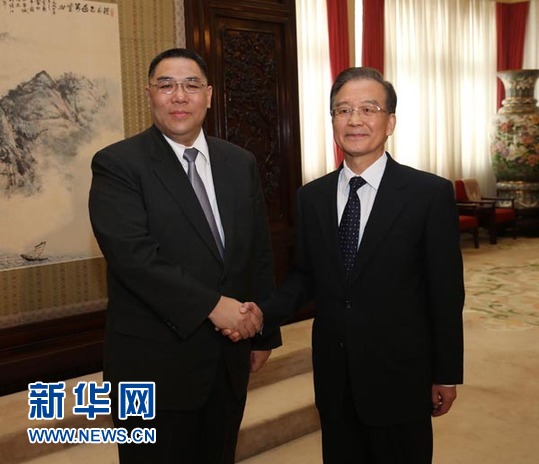 ??? 12月21日,中國國務(wù)院總理溫家寶在北京中南海會見來京述職的澳門特別行政區(qū)行政長官崔世安。 新華社記者 劉衛(wèi)兵 攝