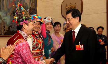 胡錦濤等黨和國家領(lǐng)導(dǎo)人走進(jìn)會場,來到身著民族盛裝的少數(shù)民族代表、委員們中間,同大家親切握手,互致問候。