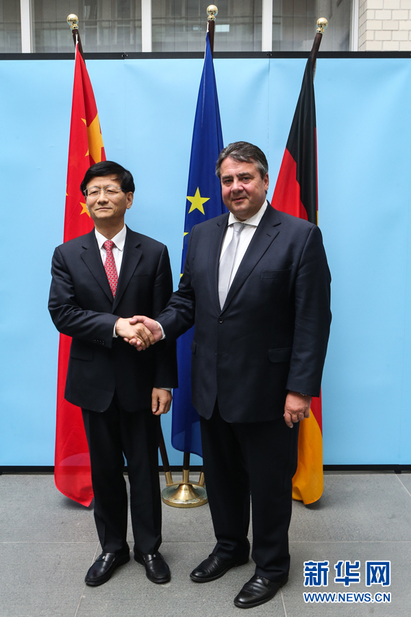 ?? ?6月29日,習(xí)近平主席特使、中共中央政治局委員、中央政法委書記孟建柱(左)在德國首都柏林會見德國副總理兼經(jīng)濟和能源部長加布里爾。新華社記者張帆攝