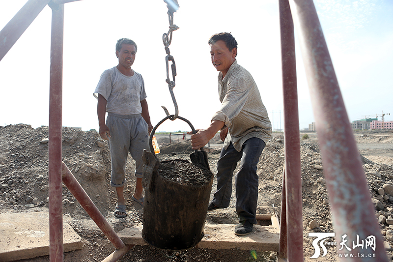 一根繩、一個(gè)桶、一輛拖拉機(jī)頭,就是庫爾班·司馬義所有的作業(yè)工具。下井時(shí),人坐在一個(gè)T形的鐵管上,用繩索固定好,一頭連著的拖拉機(jī)緩緩開動,將繩索這頭的人吊入豎井中。大約七八分鐘后,拖拉機(jī)后退,一小桶泥沙從井里升上來,庫爾班和伙計(jì)們小心地站在井口,伸手取下桶來,將泥沙倒掉又掛在繩索上,如此重復(fù)。