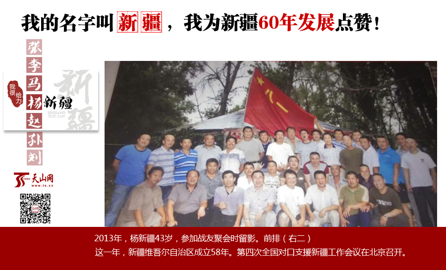 楊新疆:叫這個名字挺自豪,尤其去外地,人家一聽就知道我是新疆人,會主動找我聊天。1996年我去廣州打工,身邊來自全國各地的工友對新疆都很好奇,空閑的時候,就想聽我說說新疆到底啥樣,我就給大家介紹新疆,這讓我認識不少朋友。