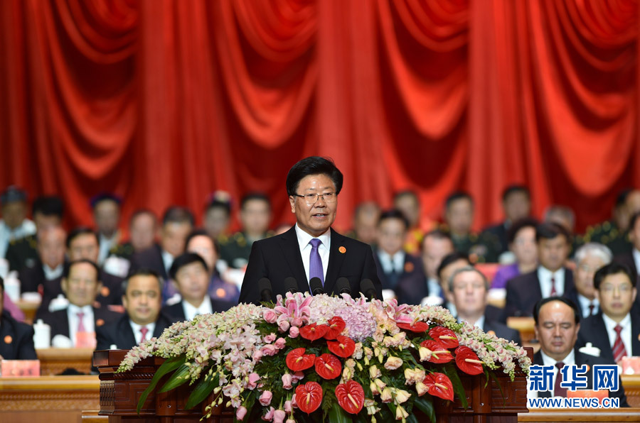 ??? 10月1日,慶祝中華人民共和國成立66周年暨新疆維吾爾自治區(qū)成立60周年大會在新疆人民會堂隆重舉行。這是中共中央政治局委員、新疆維吾爾自治區(qū)黨委書記、新疆軍區(qū)黨委第一書記、新疆生產建設兵團黨委第一書記、第一政委張春賢發(fā)表講話。新華網 郭小天 攝