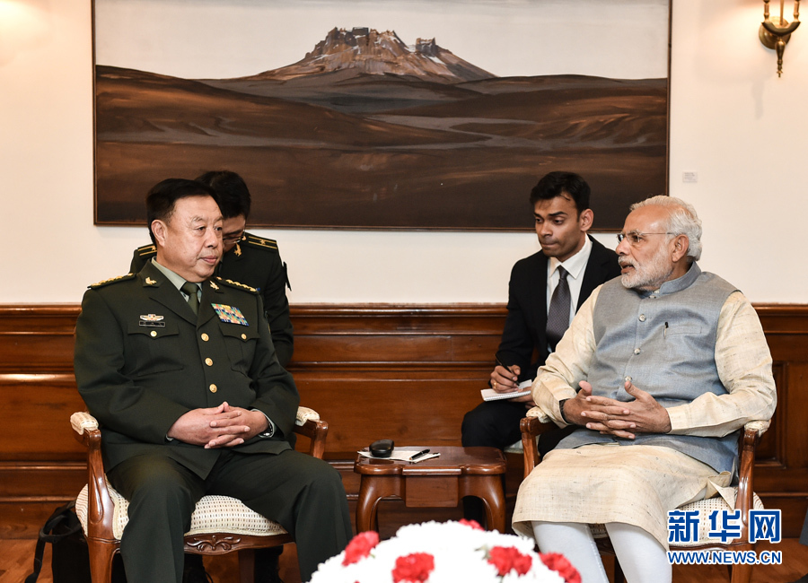 ??? 11月17日,正在印度訪問(wèn)的中央軍委副主席范長(zhǎng)龍(前左)在新德里會(huì)見印度總理莫迪(前右)。 新華社發(fā)