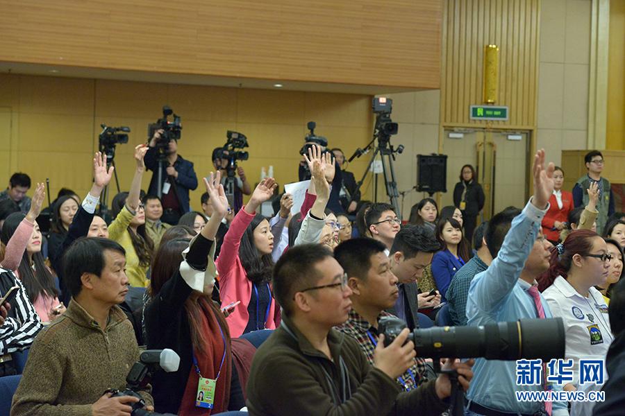 ????3月13日上午10時(shí),十二屆全國(guó)人大三次會(huì)議新聞中心邀請(qǐng)四川大學(xué)校長(zhǎng)謝和平、江蘇省教育廳廳長(zhǎng)沈健、廣東省教育廳廳長(zhǎng)羅偉其、海南大學(xué)校長(zhǎng)李建保、貴州大學(xué)校長(zhǎng)鄭強(qiáng)就完善高等教育治理結(jié)構(gòu)的相關(guān)問(wèn)題回答中外記者提問(wèn)。圖為現(xiàn)場(chǎng)記者踴躍提問(wèn)。新華網(wǎng)/中國(guó)政府網(wǎng) 郭小天 攝