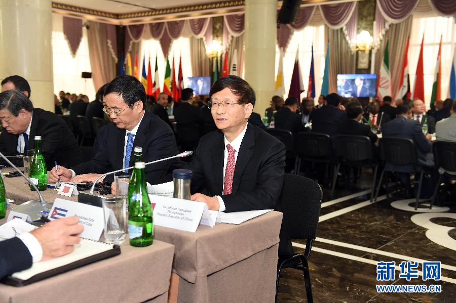 ??? 5月24日,在俄羅斯車臣共和國首府格羅茲尼,中共中央政治局委員、中央政法委書記孟建柱(前右一)在第七屆安全事務(wù)高級代表國際會議上發(fā)言。中共中央政治局委員、中央政法委書記孟建柱24日在俄羅斯車臣出席第七屆安全事務(wù)高級代表國際會議。來自70余個國家和國際組織的代表就深化國際安全合作、有效應(yīng)對恐怖主義等問題進(jìn)行探討。新華社發(fā)(郝帆攝)