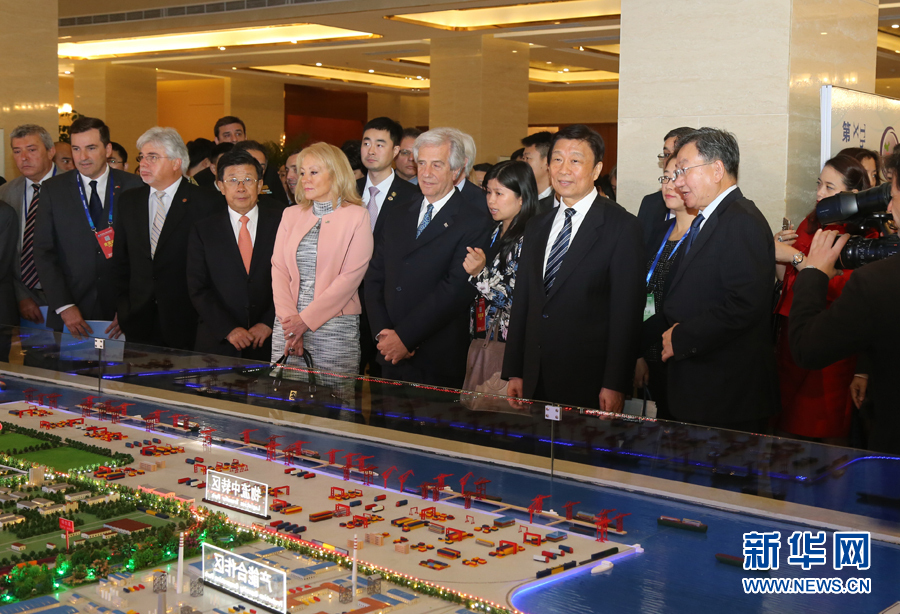 10月14日,中國國家副主席李源潮在河北唐山與參加第十屆中國-拉美企業(yè)家高峰會的烏拉圭總統(tǒng)塔瓦雷·巴斯克斯共同巡視中拉產(chǎn)能合作展覽會。這是李源潮與巴斯克斯參觀曹妃甸產(chǎn)業(yè)園沙盤。新華社記者楊世堯攝