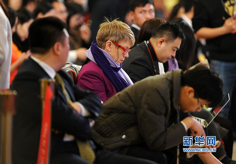 3月16日上午,國務院總理李克強在人民大會堂三樓金色大廳會見采訪十二屆全國人大四次會議的中外記者并回答記者提出的問題。圖為早早趕到記者會現(xiàn)場的各路媒體記者。新華網/中國政府網 陳競超 攝