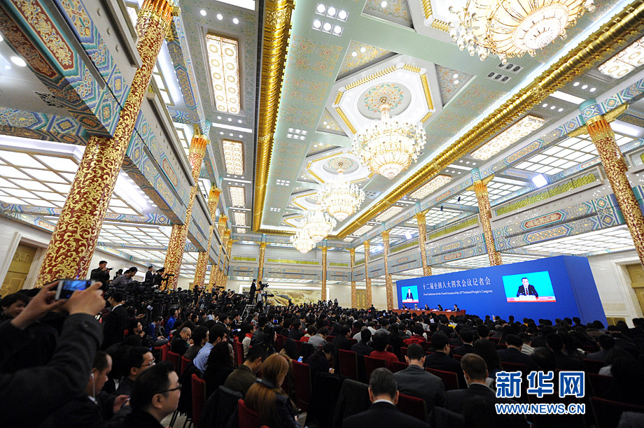 3月16日上午,國務(wù)院總理李克強(qiáng)在人民大會(huì)堂三樓金色大廳會(huì)見采訪十二屆全國人大四次會(huì)議的中外記者并回答記者提出的問題。圖為記者會(huì)進(jìn)行中。新華網(wǎng)/中國政府網(wǎng) 陳競超 攝
