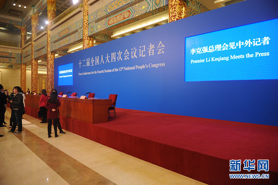 3月16日上午,國(guó)務(wù)院總理李克強(qiáng)在人民大會(huì)堂三樓金色大廳會(huì)見(jiàn)采訪(fǎng)十二屆全國(guó)人大四次會(huì)議的中外記者并回答記者提出的問(wèn)題。圖為會(huì)前現(xiàn)場(chǎng)。 新華網(wǎng)/中國(guó)政府網(wǎng) 陳杰攝