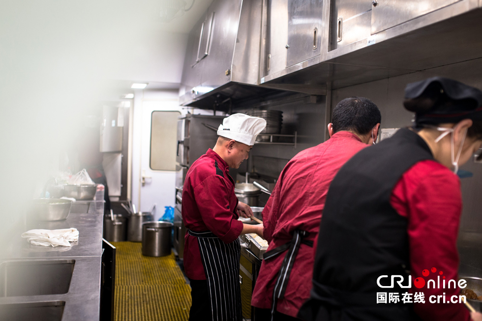 白振慶師傅說餐車上的廚師必須要手腳麻利,旅客可以在餐廳里久等一些,但是在餐車吃飯的都是急茬兒的。白師傅1980年開始在餐車工作,今年是他的第37個春運(yùn),在這37個春運(yùn)中只有今年的除夕夜是在家過的。白師傅說在家過年當(dāng)然高興,不過在車上和旅客一起過年,為旅客做一頓可口的年夜飯更是一種責(zé)任。