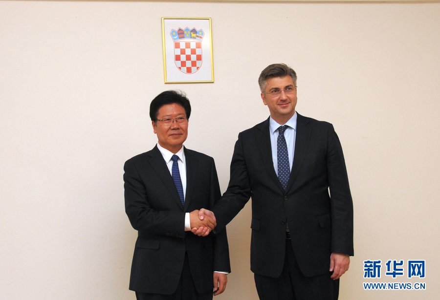 ??? 4月10日,克羅地亞民主共同體主席、政府總理普連科維奇(右)在薩格勒布會見中共中央政治局委員、中央黨的建設(shè)工作領(lǐng)導小組副組長張春賢。新華社記者薛群攝