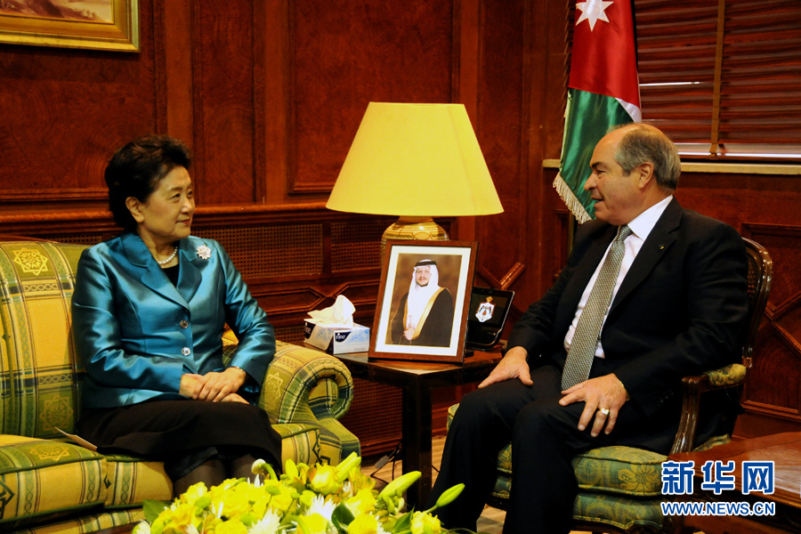 4月20日,在約旦首都安曼,約旦首相兼國(guó)防大臣穆勒吉(右)會(huì)見中國(guó)國(guó)務(wù)院副總理劉延?xùn)|。 新華社記者林曉蔚攝