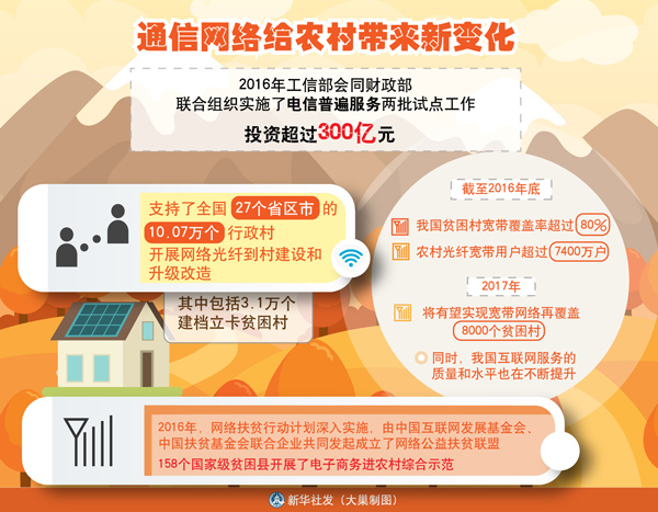 近年來,我國加大對(duì)中西部地區(qū)和農(nóng)村貧困地區(qū)移動(dòng)互聯(lián)網(wǎng)基礎(chǔ)設(shè)施建設(shè)的投資力度,加快推進(jìn)貧困地區(qū)網(wǎng)絡(luò)全覆蓋,著力降低貧困群眾享受信息生活門檻。截至2016年底,我國貧困村寬帶覆蓋率超過80%,農(nóng)村光纖寬帶用戶超過7400萬戶。今年將有望實(shí)現(xiàn)寬帶網(wǎng)絡(luò)再覆蓋8000個(gè)貧困村。同時(shí),我國互聯(lián)網(wǎng)服務(wù)的質(zhì)量和水平也在不斷提升。
